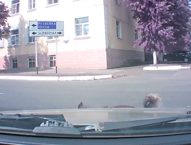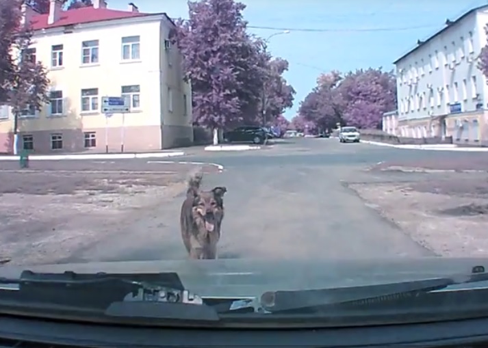 In the footage recorded by the driver’s dashcam, a dog is seen jumping right in front of his car at an intersection before refusing to let him pass.