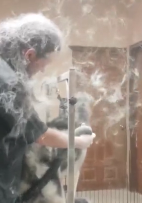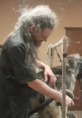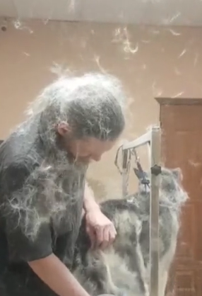 In this video, the Husky is taking it to blowdry session, and the groomer is not bothered about the fur being all over him and the room. He is simply focusing on that ask, and it shows the kind of commitment we all want to see in our groomers.
