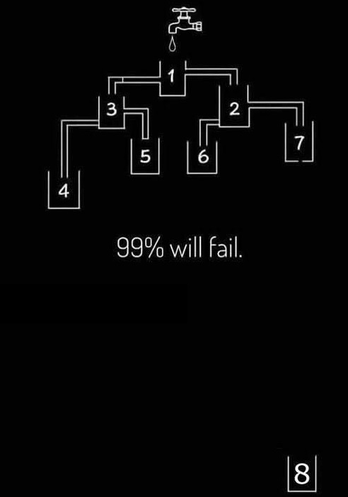 The answer to this puzzle is container #8. The eighth container will be filled with water first. Once the water level in the 1st container reaches the top pipe (note that the pipe leading to the 3rd container is blocked), the water will continue flowing into the 2nd container.