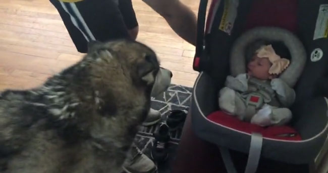 In this video, an Alaskan Malamute named Dude is waiting for his little sister to come home from the hospital.