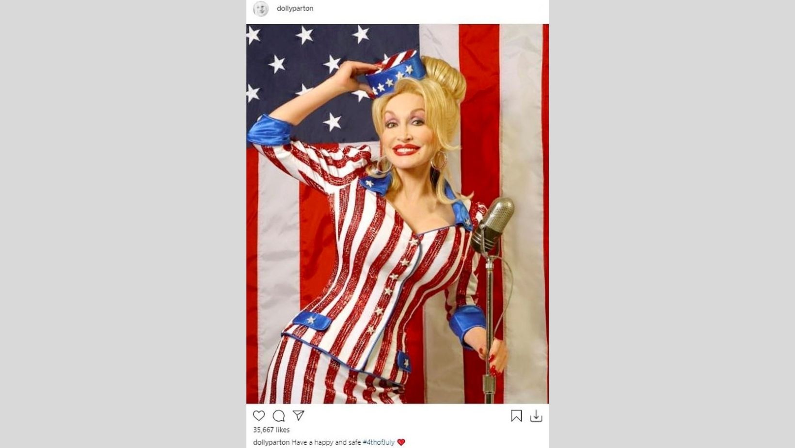 She posted a photo in a glamorous stars and stripes outfit, holding an old-fashioned microphone. Behind her is an American flag as well. The photo is a blast of red, white, and blue, patriotism, the stars and stripes, and The Queen of Country herself.