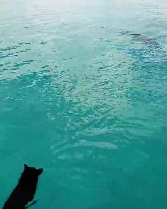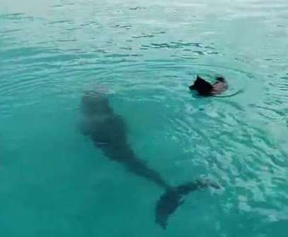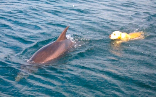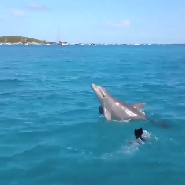 Have a look at the video and watch the dog and the dolphin swimming around in circles and enjoying the cold blue water together.