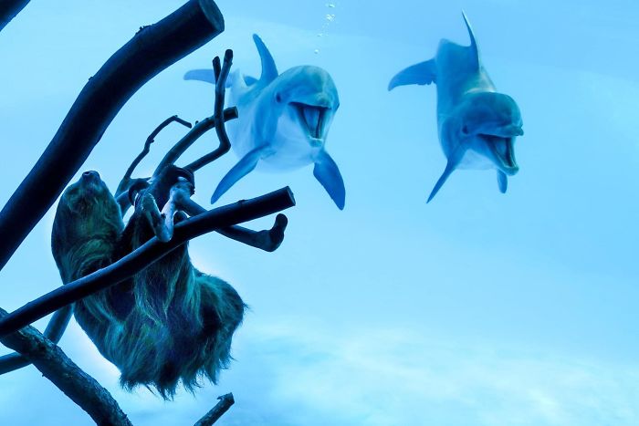 Sloths may not be the most expressive creatures around but dolphins definitely are. That’s probably the reason why Texas State Aquarium allowed these animals to meet each other.