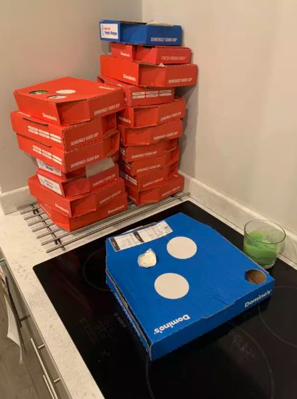 When she opened the door for the delivery guy she was equally shocked and embarrassed as she saw that her beloved boyfriend had ordered one large pizza, a side of wedges, one garlic bread, a box of cookies and FIFTEEN sides of chicken wings.