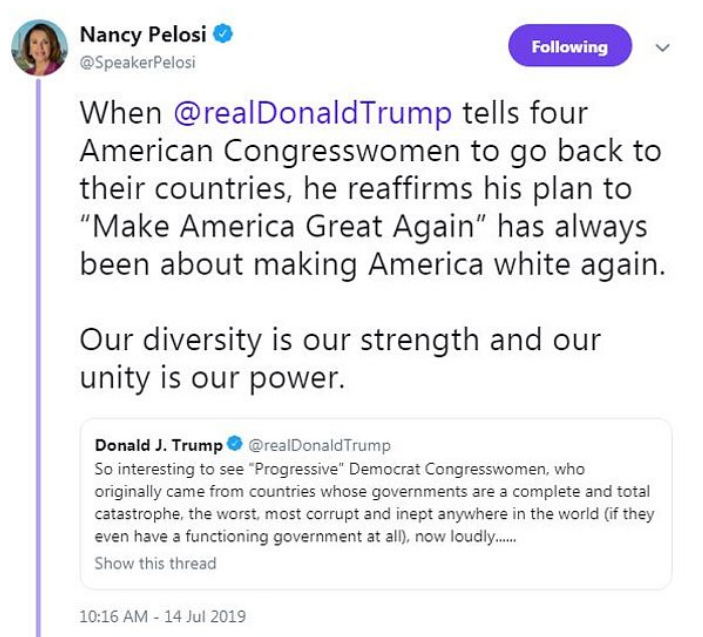 He was also attacked by Nancy that he wants to make America white again to which he retaliated saying that he never said that. Nancy tweeted that when he told the four Congresswomen to leave, his plans to ‘Make America Great Again’.