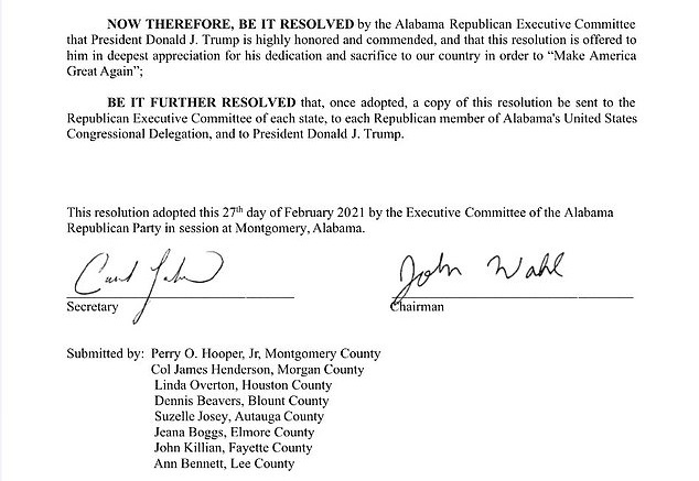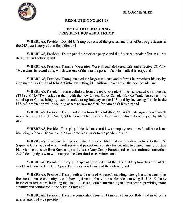 In a bombshell resolution, the Alabama GOP praised the 45th President and his achievements including the actions he took to allegedly save jobs, cut taxes and expand the US Military.