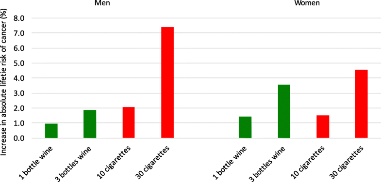 The risk of developing cancer also rises considerably when a person drinks three bottles of wine per week. As the researchers suggest, 19 in 1,000 men and as much as 36 in 1,000 women would develop cancer from drinking this amount of wine.