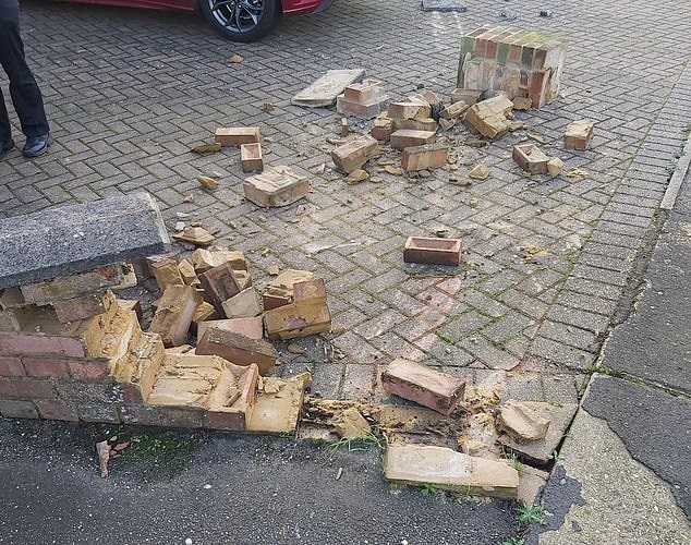 In another photo, the damage done to the brick wall is documented, whereas broken bricks are seen scattered across what appears to be a driveway.