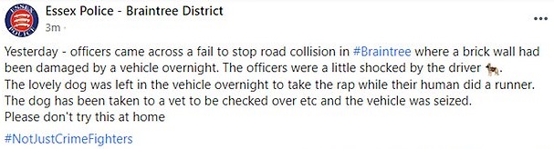 “Yesterday officers came across a fail to stop road collision in Braintree where a brick wall had been damaged by a vehicle overnight,” Essex Police revealed in a Facebook post.