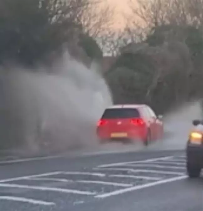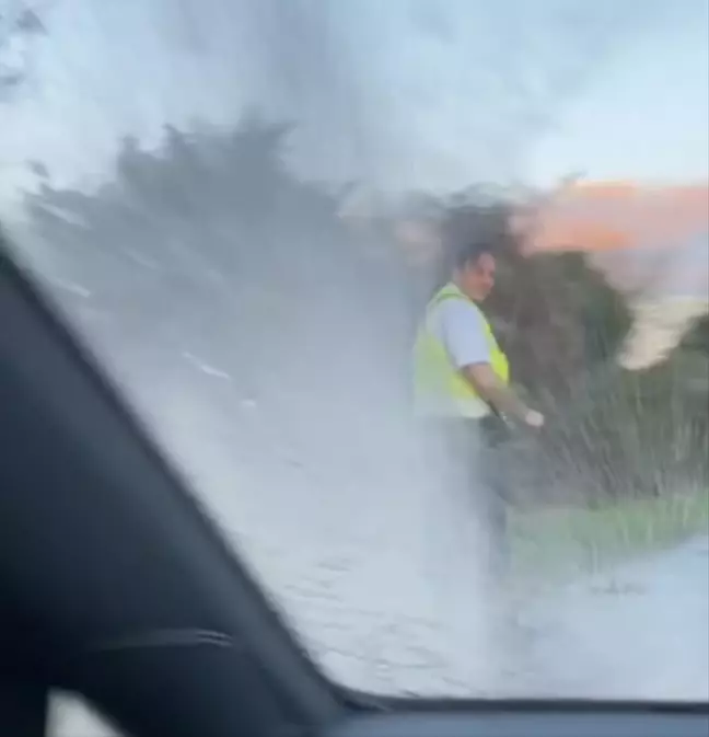 This is what happened to a driver as he saw a puddle of standing water. Unfortunately, someone who appeared to be a police officer was walking dangerously close to it.