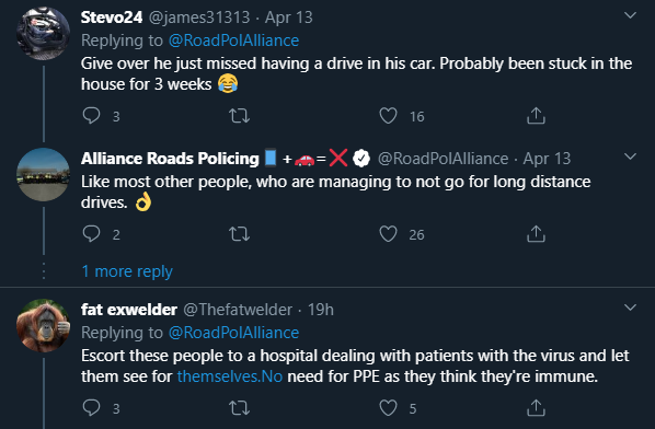 “Taking your BMW out for a spin on a 170 mile round trip to have a break from the wife and three kids is also not an essential journey!” Alliance Roads Policing wrote.