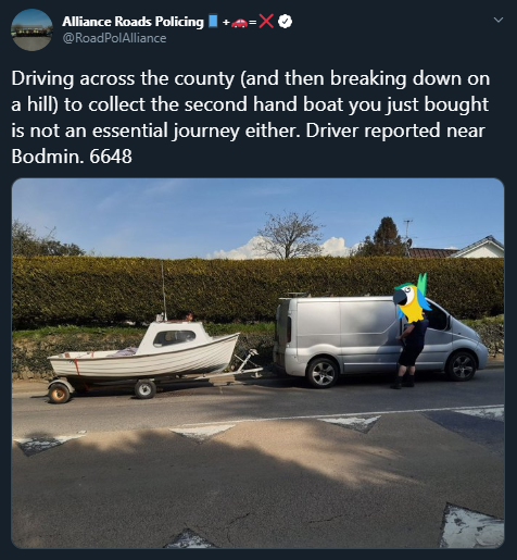 “Driving across the county (and then breaking down on a hill) to collect the second hand boat you just bought is not an essential journey either. Driver reported near Bodmin. 6648,” they wrote on Twitter.
