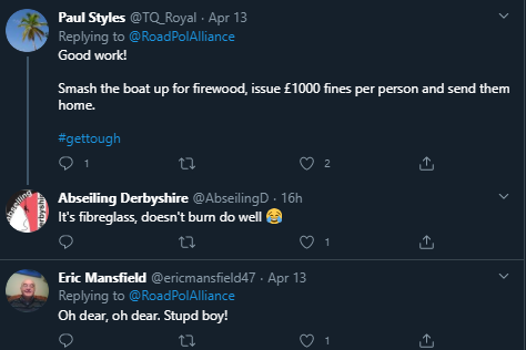 A third said: “Smash the boat up for firewood, issue £1000 fines per person and send them home.”