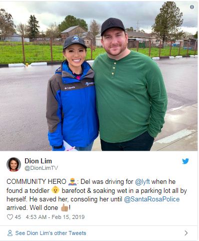 In Santa Rosa, California, it was dark and cold on last Tuesday at 10:30 p.m. and luckily that same day a guy named Del Hedrick was driving for Lyft, and he ran into a scary scene where he saw a toddler alone in such weather.