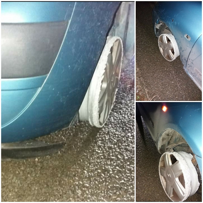 Police noticed the vehicle ‘struggling’ at around 1:50 am on the M66 near Bury, Great Manchester and were shocked when they realized the car had no front tires.