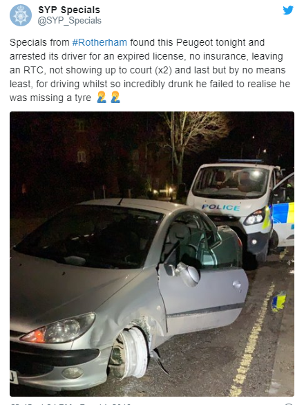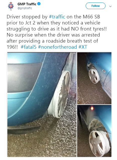 The Greater Manchester Police shared the shocking incident on Twitter and wrote: “Driver stopped by #traffic on the M66 SB prior to Jct 2 when they noticed a vehicle struggling to drive as it had NO front tyres!! No surprise when the driver was arrested after providing a roadside breath test of 196!! #fatal5 #nonefortheroad #XT.”