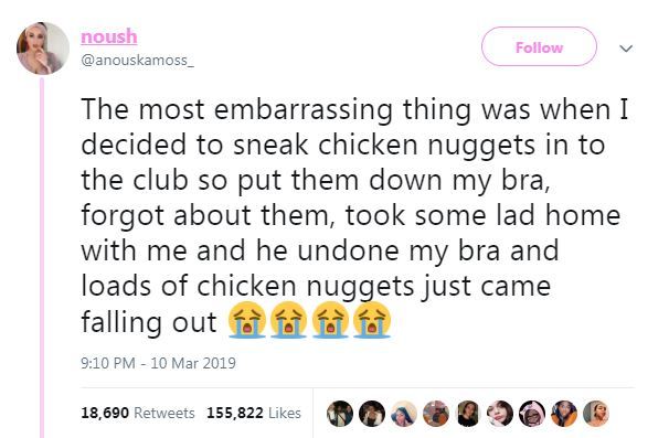 22-year-old Anouska Moss wrote about the cringe-worthy moment on Twitter where she admitted: “the most embarrassing thing was when I decided to sneak chicken nuggets into a club so I put them down my bra.”