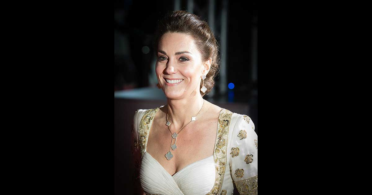 The Duchess Kate Middleton stuns the audience with a recycled white and gold Alexander McQueen gown.