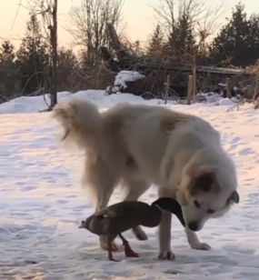 As soon as he steps out he is greeted by the duck. At first, you may think the duck is going to annoy the dog but it looks like they have been best friends for a really long time and the dog is used to it.