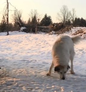 It is early morning and this dog is wide awake so he decided to take a walk out in the snow. But it looks like he is not the only one who is awake at the break of dawn.