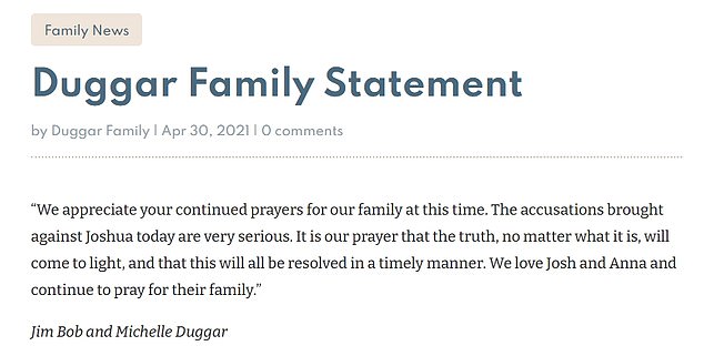 “We appreciate your continued prayers for our family at this time. The accusations brought against Joshua today are very serious,” his parents said.