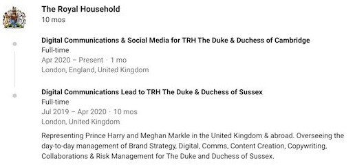 The-27-year old has updated his LinkedIn profile in which he mentioned he has now assigned for the role of Digital Communications & Social Media for TRH The Duke & Duchess of Cambridge.