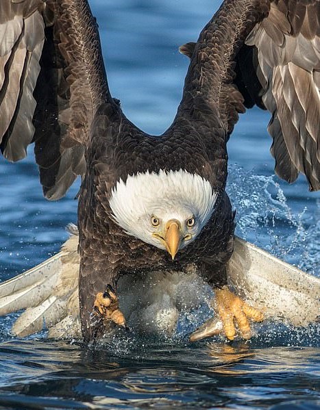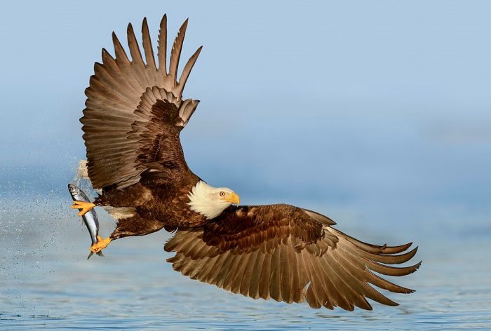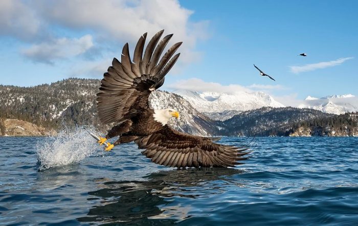A 59-year-old photographer shared stunning photos that show a bald eagle taking an unlucky fish from the Alaskan seas.