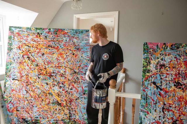 In one of the photos, Ed can be seen with a blank canvas in front of him and the wall and cupboards behind him covered in splashes of paint.
