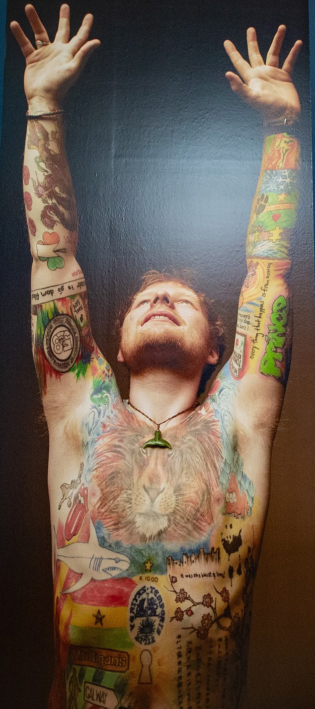 In the exhibition, the Suffolk-born singer’s incredible body with tattoos took center stage in a still got from the video for his hit single Shape Of You.