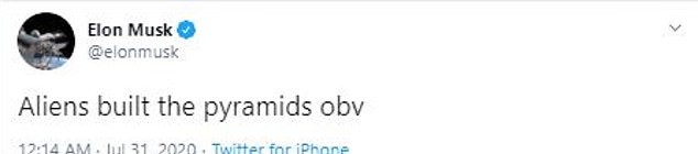 Elon Musk wrote on Twitter: “Aliens built the pyramids obv.” His tweet received over 500,000 likes and reshared more than 87,000 times.