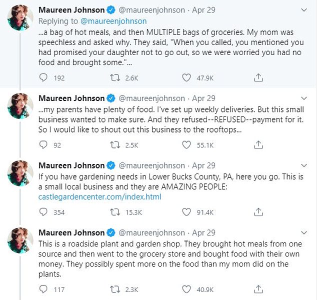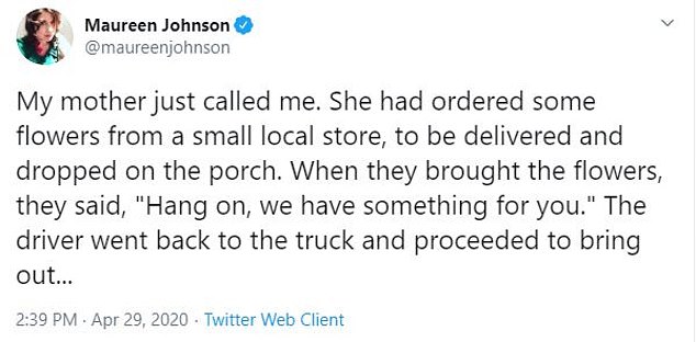 Mary’s daughter, Maureen Johnson, shared the heartwarming story on Twitter: “My mother just called me. She had ordered some flowers from a small local store, to be delivered and dropped on the porch. When they brought the flowers, they said, “Hang on, we have something for you.”