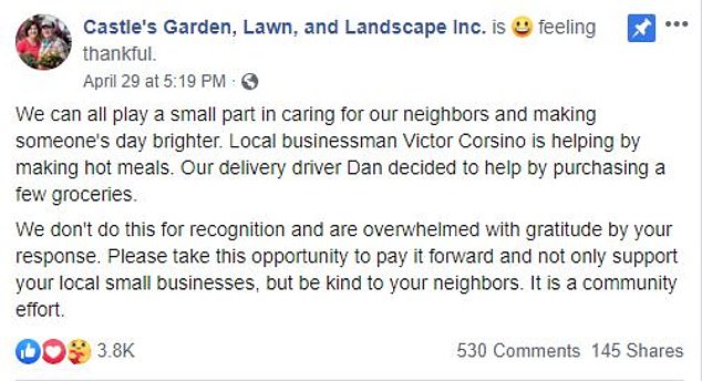 Castle’s Garden, Lawn, and Landscape Inc. wrote on Facebook: “We can all play a small part in caring for our neighbors and making someone’s day brighter. We don’t do this for recognition and are overwhelmed with gratitude by your response.