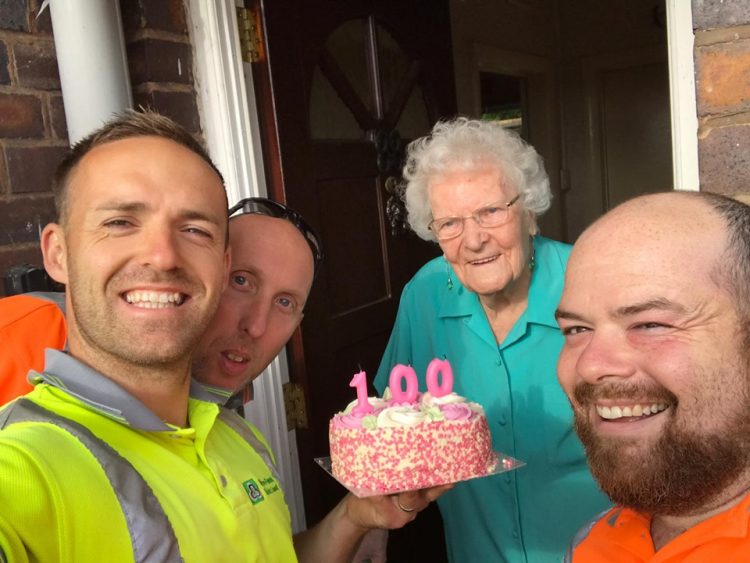 An elderly woman received a special surprise on her 100th birthday when garbage collectors arrived on her front porch with a cake to celebrate her special day.