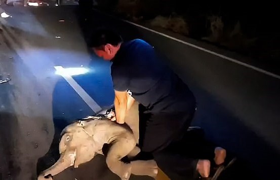A one-month-old elephant was left crying in pain after a motorcyclist crashed into it in Chanthaburi, Thailand.