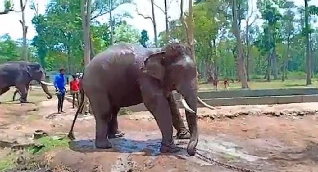 It is seen that the poor elephant was tied with a chain on his foot and trunk and then it collapses on its left side. According to the officials, Drona died when he went to drink water from the tank nearby.