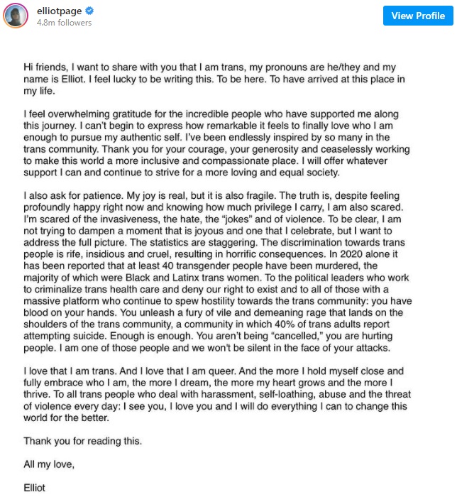 Elliot Page has spoken out and revealed that he underwent top surgery that saw his breasts removed.