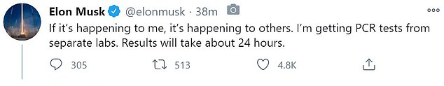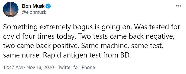 Musk took to Twitter and wrote: “Was tested for covid four times today. Two tests came back negative, two came back positive. Same machine, same test, same nurse. Rapid antigen test from BD.”