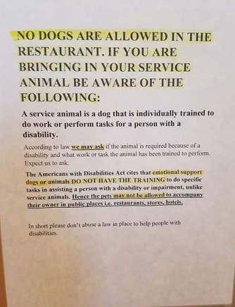 Recently, a restaurant put up a board saying it does not allow emotional support animals in its premises.