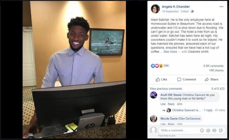 Angela Chandler, one of the hotel guests, wrote on Facebook: “Satchel has been here all night. His coworkers couldn’t make it to work so he stayed. He has manned the phones, answered each of our questions, ensured that we have had a hot cup of coffee or tea, and helped serve us a hot breakfast. He has handled this situation with grace, kindness, and a beautiful smile on his face.”
