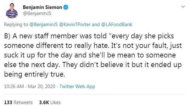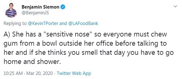 TV writer Benjamin Siemon allegedly said: ‘Everyone must chew gum from a bowl outside her office before talking to her and if she thinks you smell that day you have to go home and shower.’