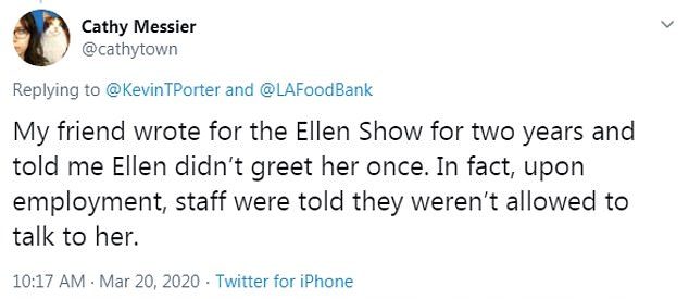 Another claimed that Ellen never greeted one of her friends who had written for the host for two years. She wrote: ”My friend wrote for the Ellen show for two years and told me Ellen didn’t greet her once. In fact, upon employment, staff were told they weren’t allowed to talk to her.”