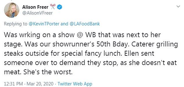 She wrote, ”[It] was our showrunner’s 50th Bday. Caterer grilling steaks outside for special fancy lunch. Ellen sent someone over to demand they stop, as she doesn’t eat meat. She’s the worst.”