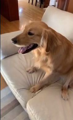 This Golden Retriever is having difficulties in getting up from the bed and going out for a walk with the owner.