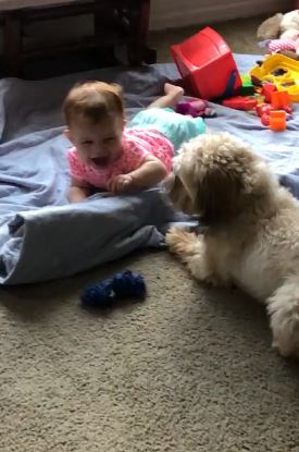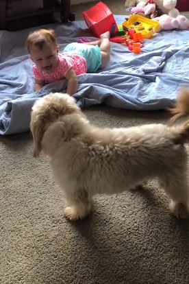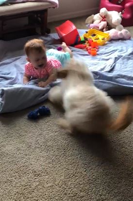 Watch this adorable video of the energetic puppy entertaining the baby.