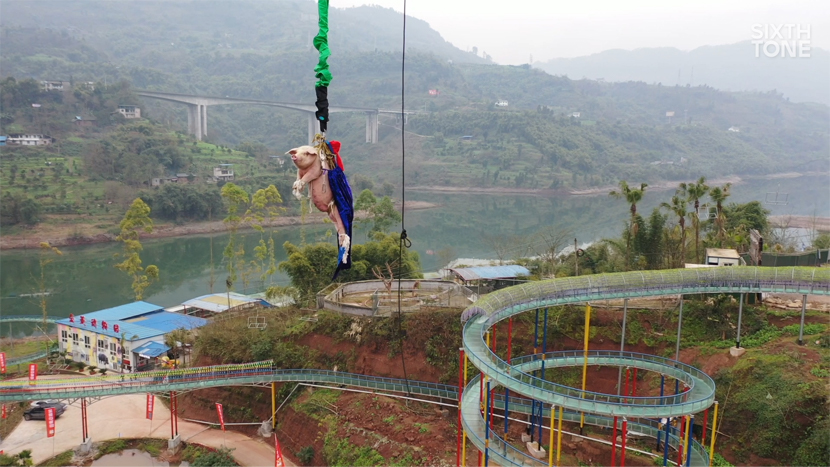 “We held the event to symbolize the passing of the year of the pig, and the coming of the year of the rat. The pig jumping from such a great height also symbolizes the falling price of pork,” the spokesperson said.