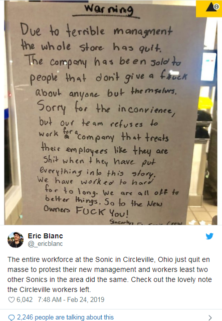 The note read “We are sorry for the inconvenience but our team refuses to work for a company that treats their employees like they are shit when they have put everything into their store.”