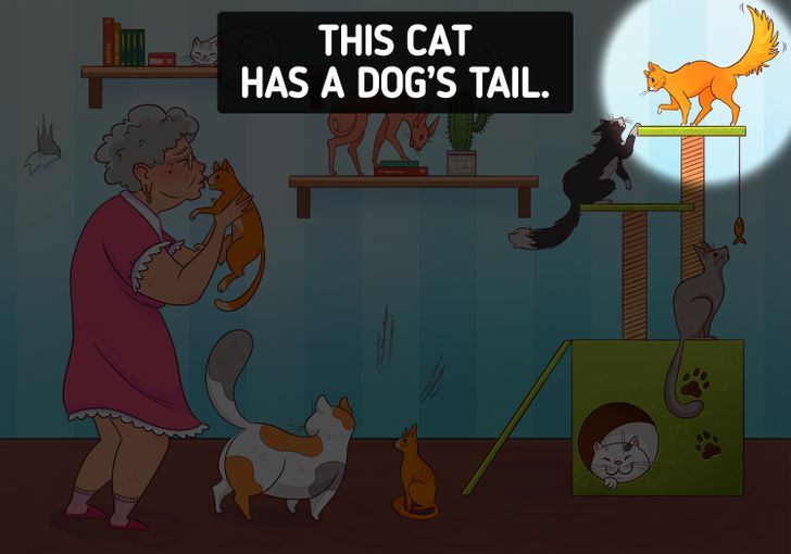 The picture shows a grandmother kissing an orange cat. Her home is filled with many playful felines and it is safe to say that she is a cat lover.