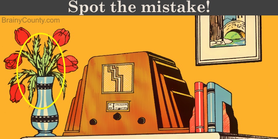 This time, it’s your job to find the mistake in a vintage picture showing a radio, a vase full of tulips, a framed painting, and a set of books.