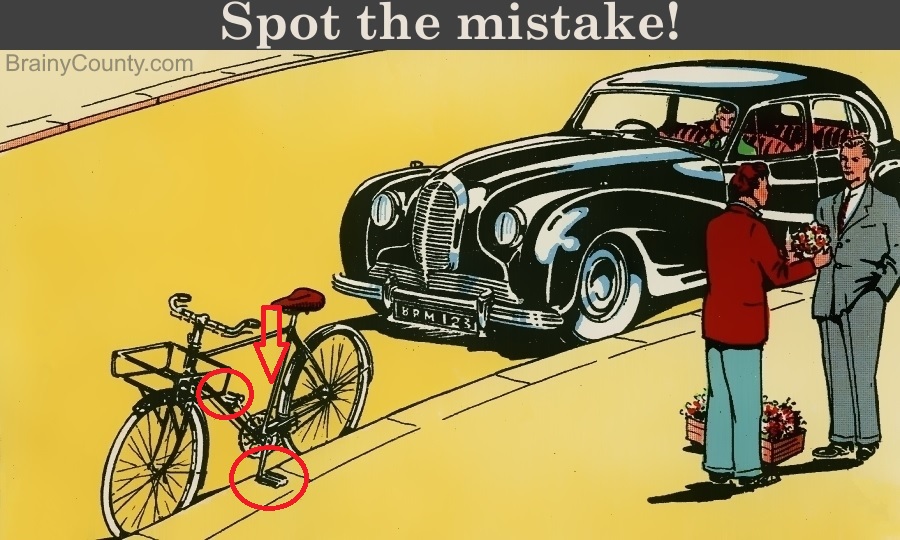 As we already suggested, the mistake concerns the bike on the left side of the picture. Even with this information, however, most people still can’t spot the error.