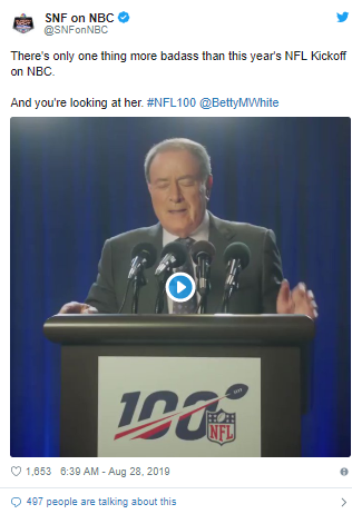 The video started with Al Michaels, the legendary commentator, standing at a podium where he is wondering about how anyone could put 100 years of the NFL into words. To this, Betty White shouts from off-screen that she can.
